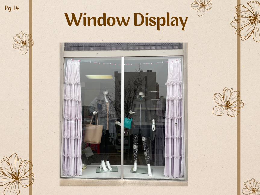 For this project, I had to apply my knowledge within the visual merchandising field and apply it in a real life setting. I was able to partner with a boutique, Sweet P's Fashions, in my hometown and collaborate with them to create and organize different visually appealing fixtures. Down below you will see my work for window displays, styling mannequins, table and floor fixtures, and a wall fixture.